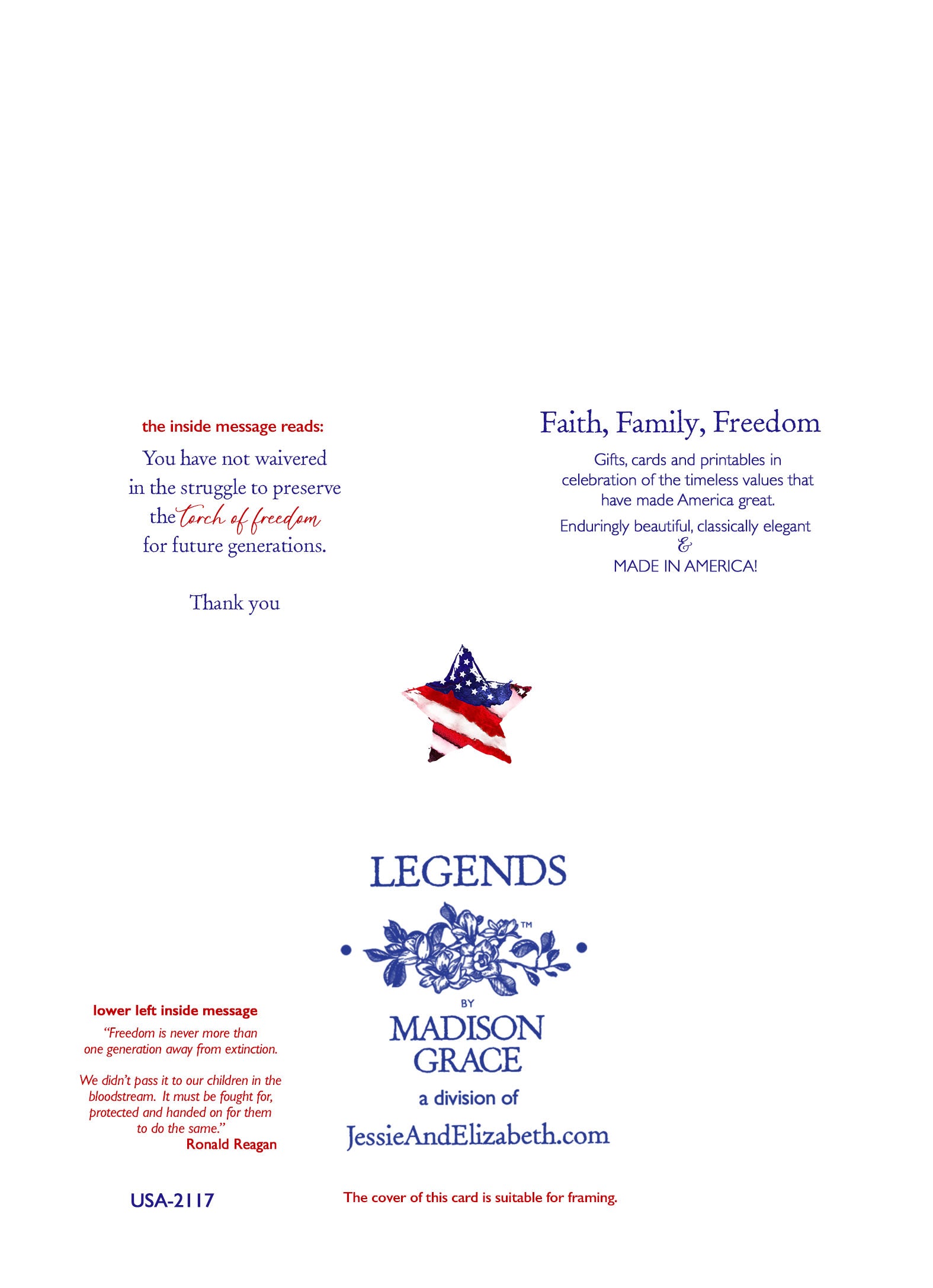 Honor those who have faithfully defended liberty with this striking patriotic card. The front features a bold watercolor silhouette of the Statue of Liberty, beautifully overlaid with the stars and stripes of the American flag—a powerful tribute to freedom and sacrifice.